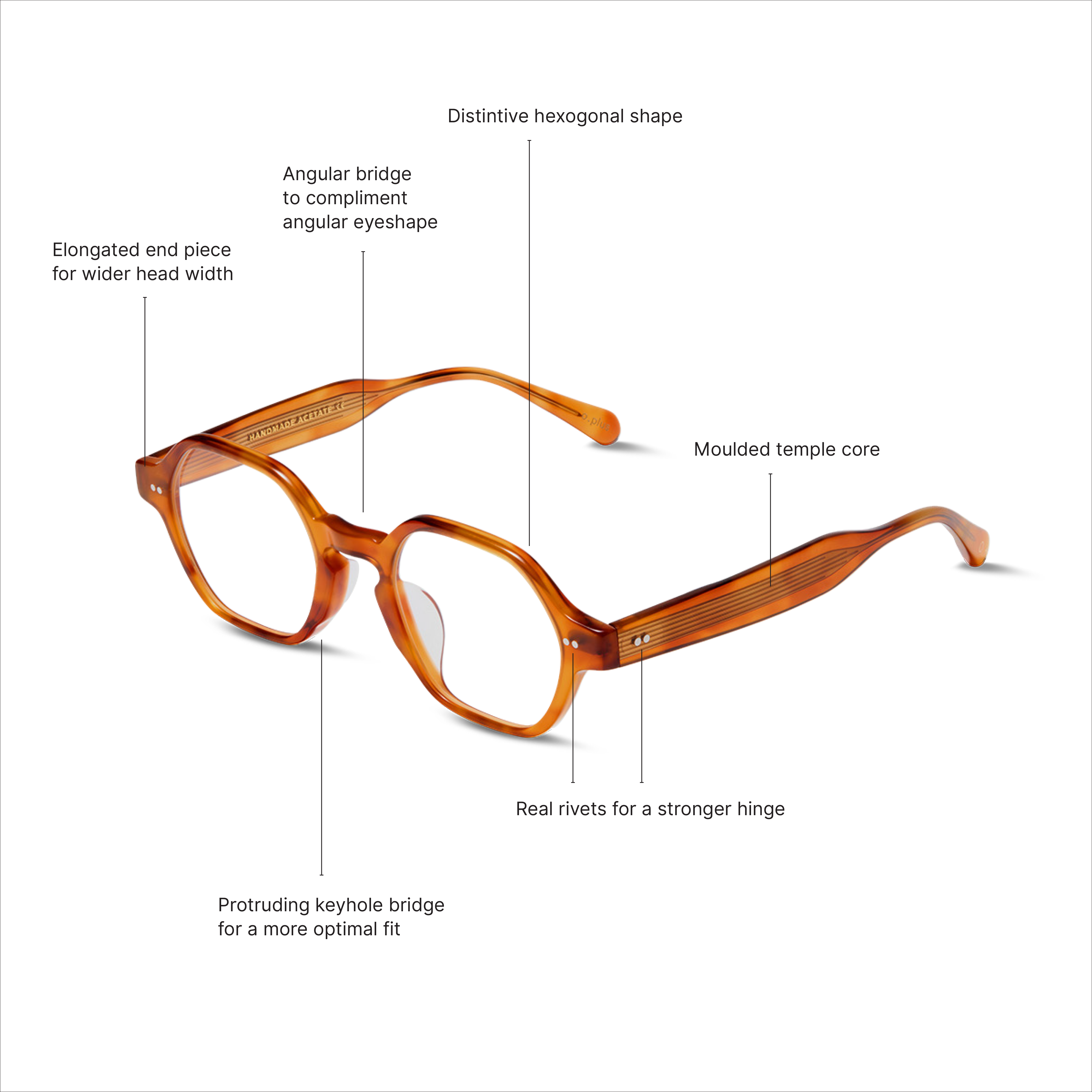 Gable is defined by precision, with a hexagonal frame, angular bridge, and thickened keyhole nose for a sharp yet secure fit. Functional rivet hinges and balanced proportions give it lasting strength and unmistakable presence.